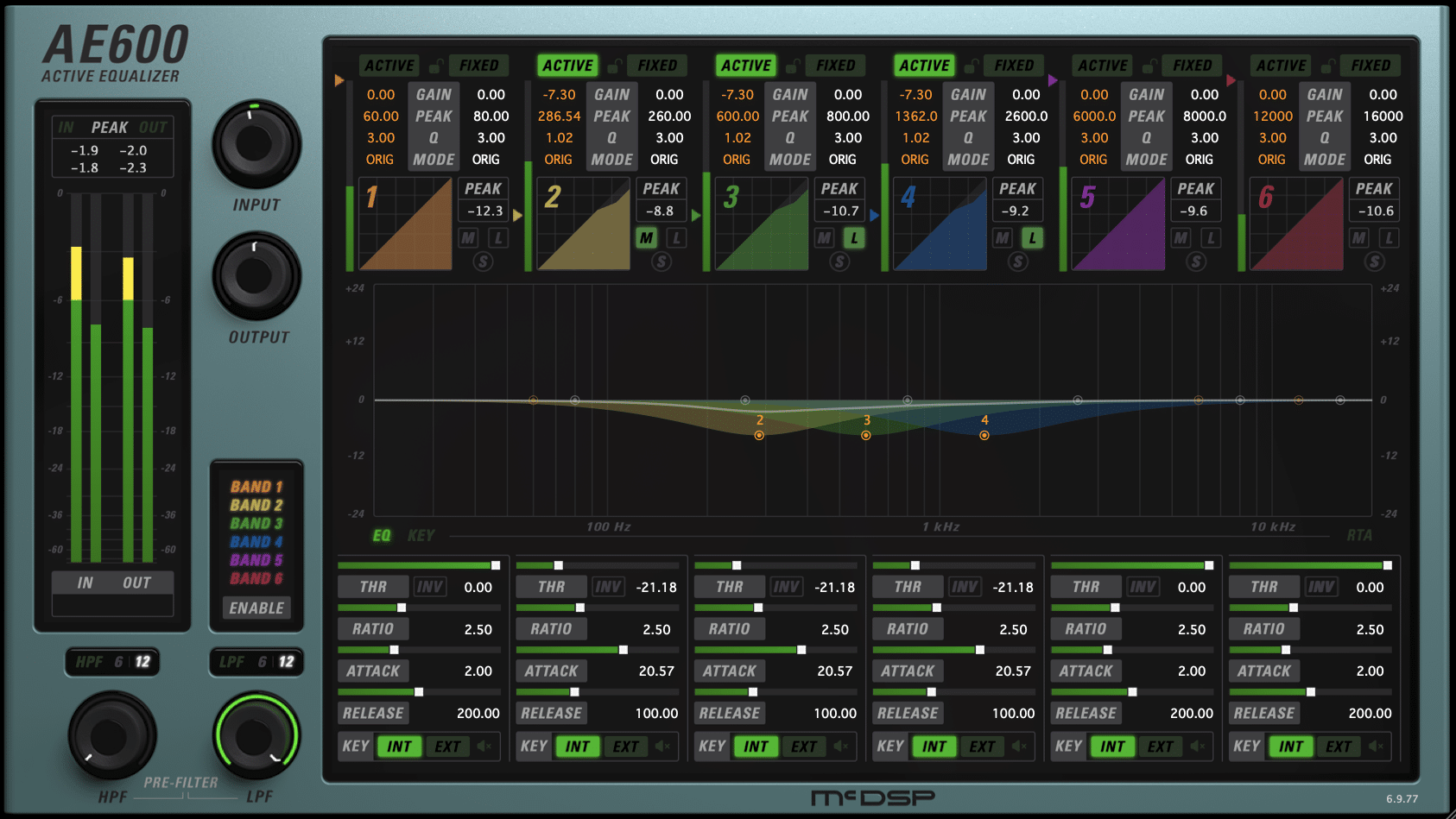 The AE600’s external sidechain feature on each band, along with its 6 active bands and 6 additional fixed bands, make it the perfect plug-in for this application. Simply route your vocal bus into the sidechain input of the AE600, engage the external sidechain setting for each mid-range band, and dial the plug-in to taste!