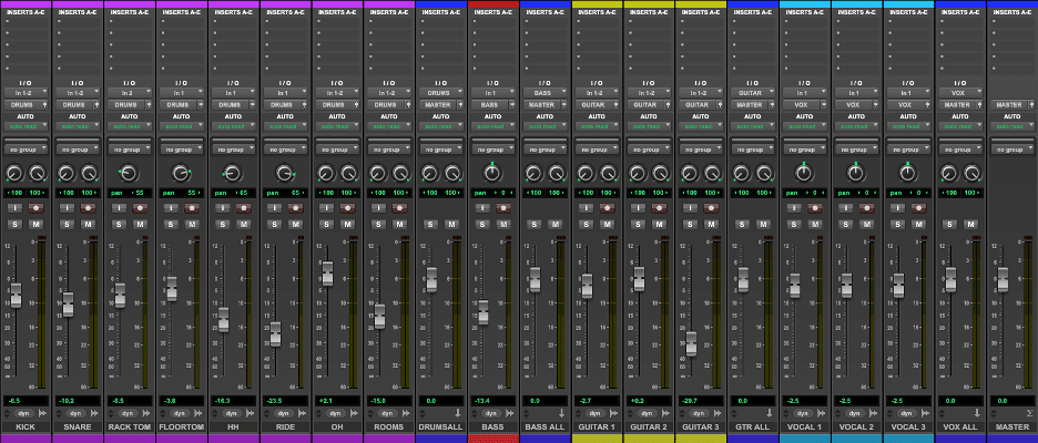 A Mixing Session with Rough Volume Balances and Panning Set