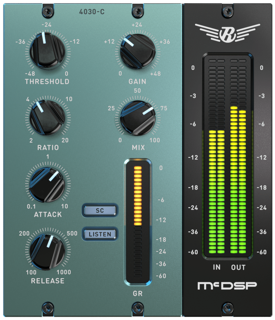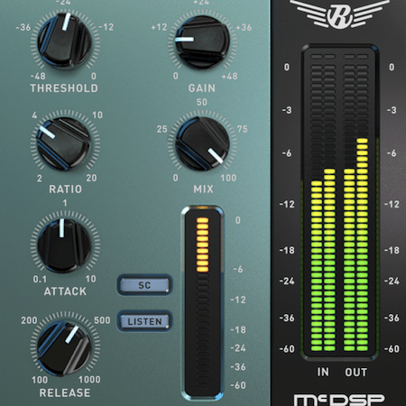 The 4030 Retro Compressor is a unique dynamic range control topology. It is coupled with a wet/dry mix control to balance compressed and uncompressed signals. An active attack and release design allows aggressive compression settings with minimal artifact generation. All Retro plug-ins use a McDSP designed output stage that puts a unique transformer-like touch on the audio signal.