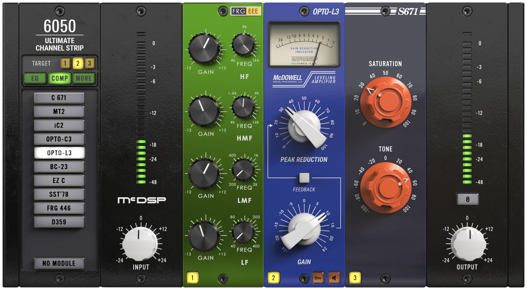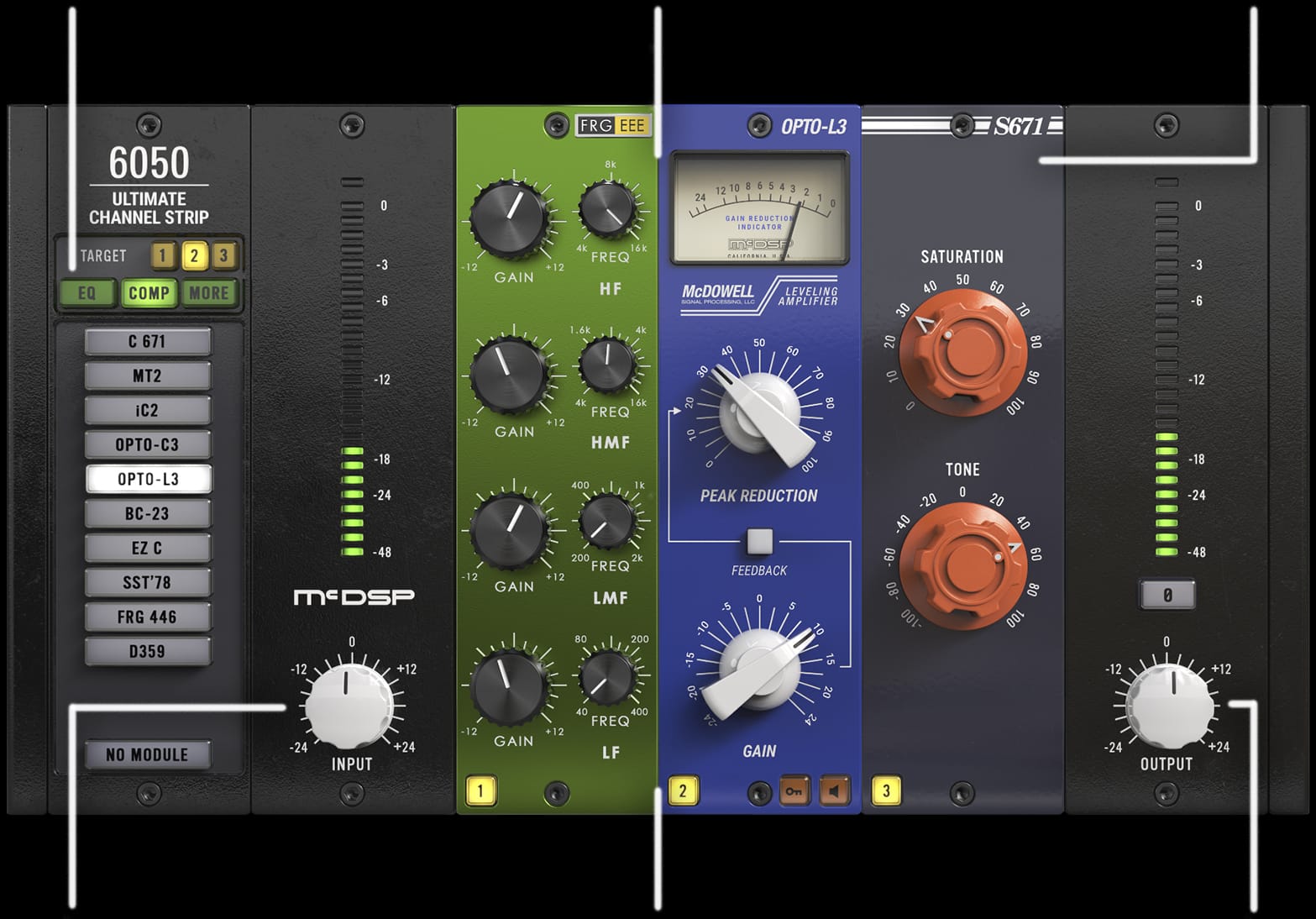 The 6050 Ultimate Channel Strip has input and output stages, wrapped around 3 module bays in which any of the over 25 modules can be inserted. Easily drag and drop any module to rearrange the signal flow of your channel strip. A module selector panel allows quick auditioning of equalizers, compressors and additional effects. Like the original 6020 and 6030 plug-ins, each new module in the 6050 draws on classic and modern designs over the last four decades. Operation is simple and intuitive, and the sound quality is what professionals worldwide have come to know in McDSP plug-ins.