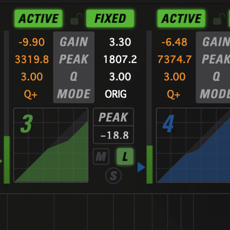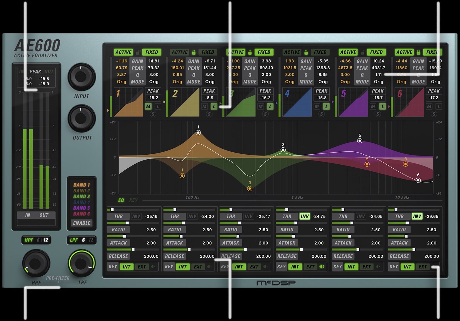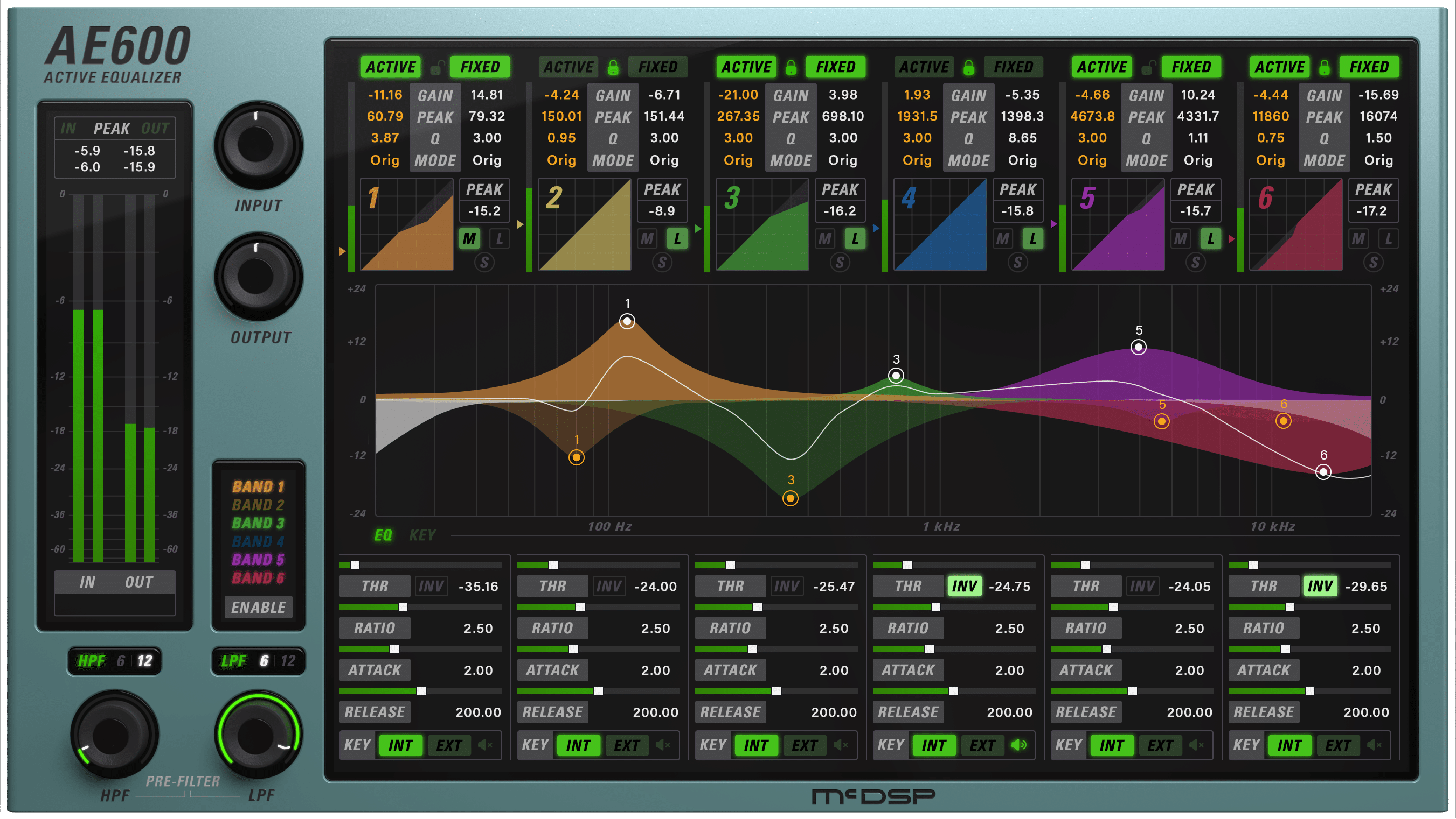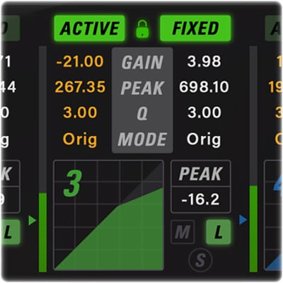 New and unique EQ modes, independent control of fixed and active EQ bands, and an ultra low latency algorithm make the AE600 the perfect solution for any audio production. Every fixed and active band in the AE600 has its own gain, frequency, Q, and mode controls. Mode options include parametric, proportional Q parametric, 5x Q parametric, Baxandall shelving EQ, vintage styled EQ, and a new X-style shelving EQ. All bands are completely overlapping and can use the input signal or selected side chain inputs to trigger the active EQ response.