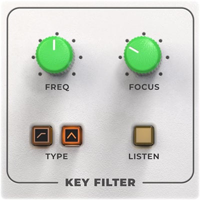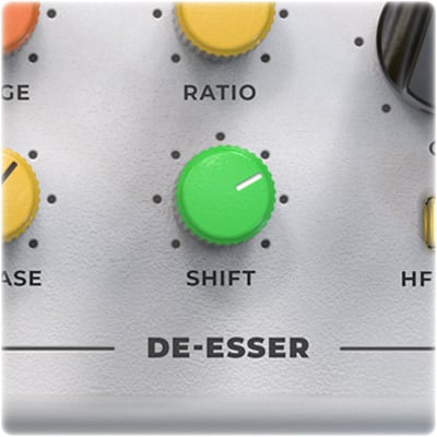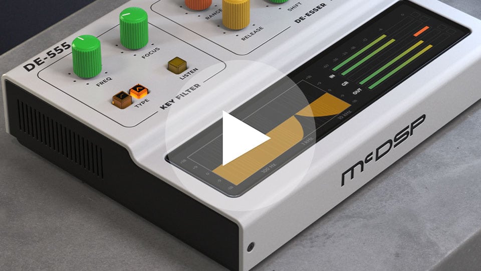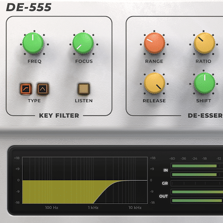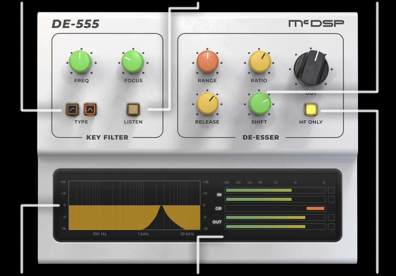 Key filter options include high pass and band pass filtering. A unique focus control further enhances the key filter’s ability to separate ‘essing’ from actual dialog. The key filter output can also be monitored. Real-time displays of de-essing amounts and key filter response enable quick and easy setup.