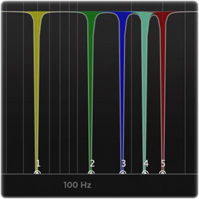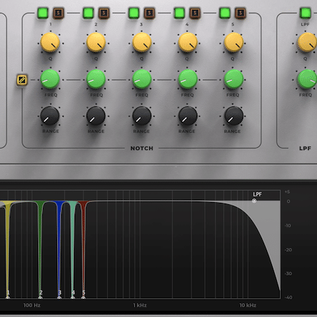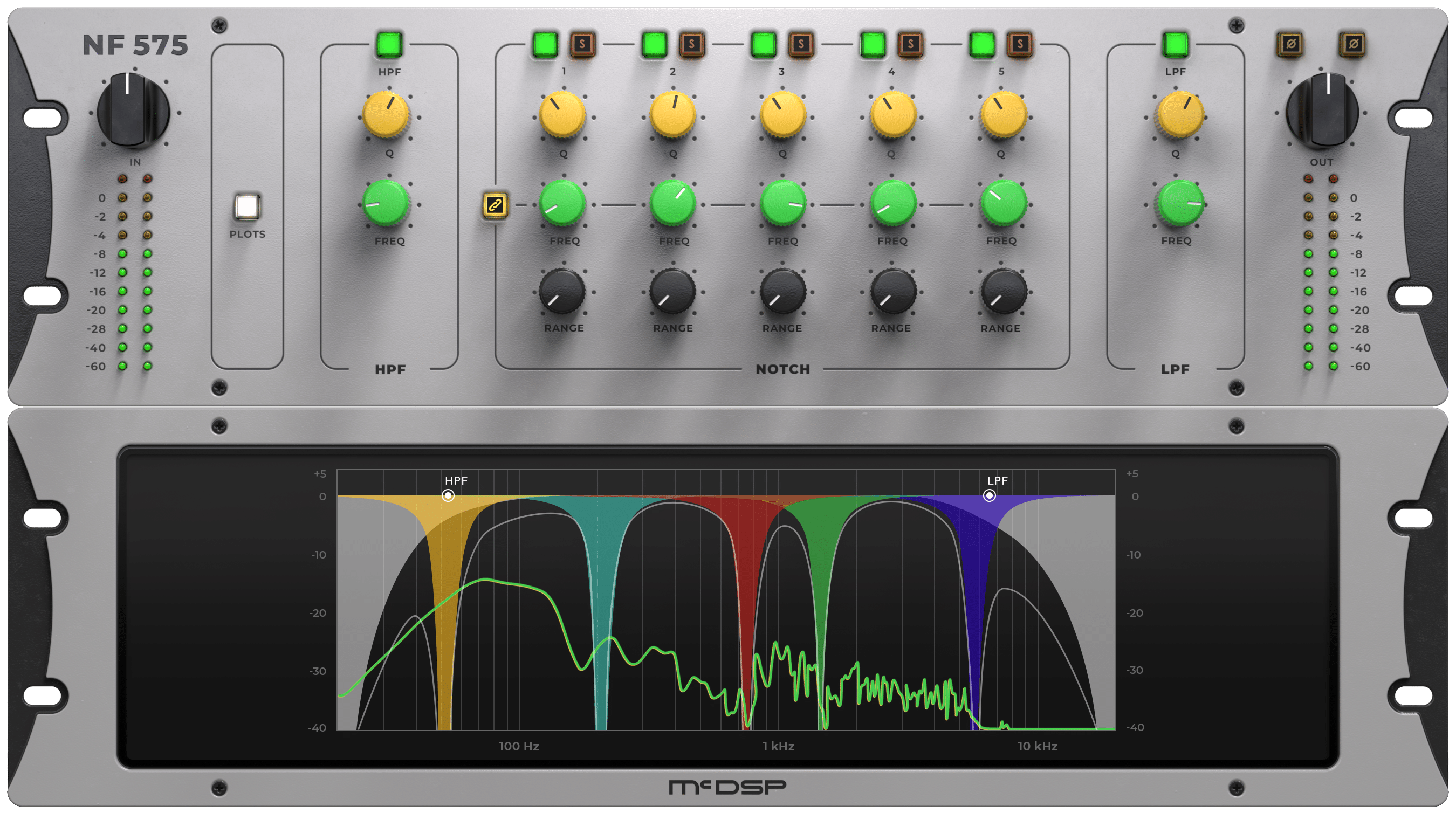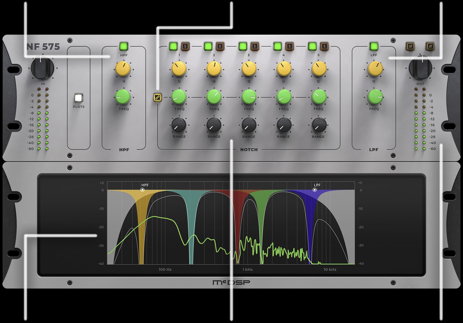 Advanced notch filters allow the user to select the amount of signal cut, cut frequency, and width (Q). All five NF575 notch filters can be linked harmonically to address common cyclical noise problems such as 60 Hz hum.